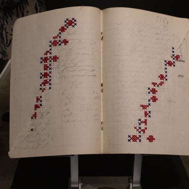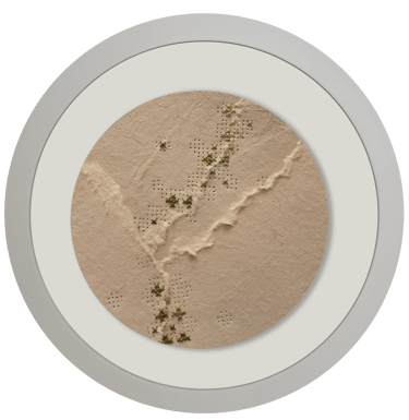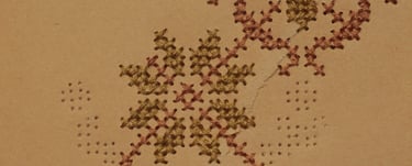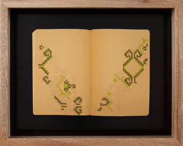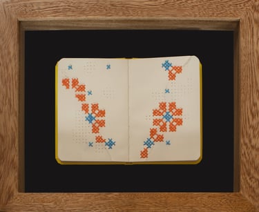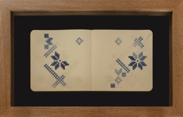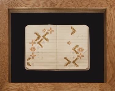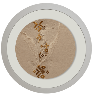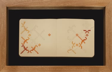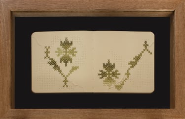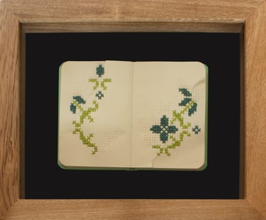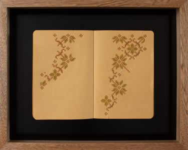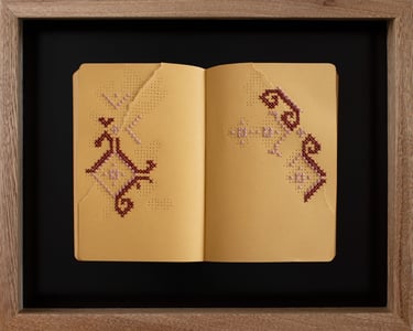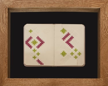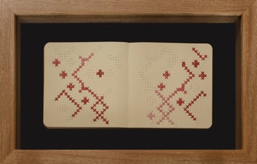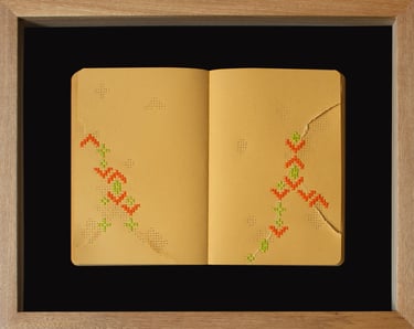 La serie Corte, Herida y Cicatriz (2024) es una investigación plástica que retoma la técnica del bordado como medio para explorar las inscripciones del dolor, la herida y el duelo, resultados del quiebre, de la ruptura de los vínculos que hemos construido. La rasgadura del papel, como la herida misma, es irreversible, y su cicatriz, imborrable; sin embargo, el remiendo (sutura) de dicho corte, a través del bordado y del patrón, le imprime a la herida una reivindicación casi poética: la cicatriz se transforma en traza, dibuja la ruta que seguirá el patrón en su incansable intención de restauración. Por otro lado, esta es una pieza que no solo alude a las continuidades, a los actos de cuidado y reparación, sino también al retorno constante, no solo visual, sino a aquel retorno conductual que muchos cimentamos con la perpetuación consciente o inconsciente de ciertos patrones familiares y generacionales; o en contraparte, con la conciencia de su ruptura y transformación.