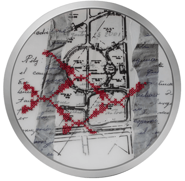 La pieza integra capas de cartas y postales, conservadas como vestigios materiales de la memoria y la historia familiar. A través de un hilo rojo, bordado con la técnica de punto de cruz, se trazan trayectos que conectan y disocian estos espacios geográficos. Este hilo simboliza la búsqueda de la proximidad en la distancia y representa los caminos divergentes de algunos miembros de mi familia.